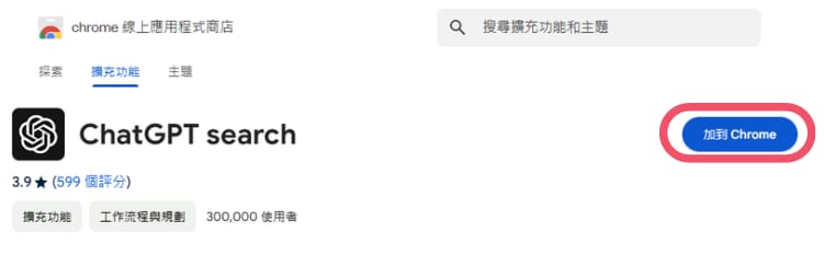 Step 1:點擊下方的 ChatGPT Search 擴充套件連結,選擇「加到 Chrome」按鈕進行安裝。