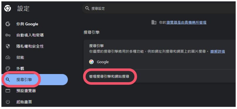 Step 2:選擇「搜尋引擎」,點選「管理搜尋引擎和網站搜尋」。